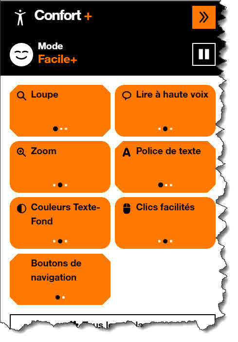 Les réglages de Confort+ ne fonctionneront correctement que sur un site respectant les règles d’accessibilité. Si le site est inaccessible il risque d’être fortement compromis. Un bouton Pause permet alors de temporairement désactiver Confort+.