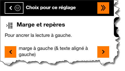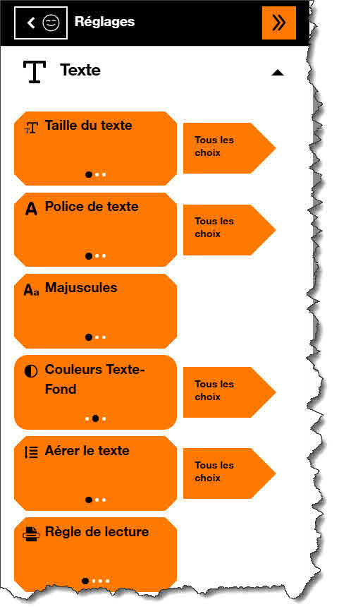 En cliquant sur le bouton « Tous les réglages » en bas de la palette de l’accueil, vous pouvez accéder à l’ensemble des réglages disponibles dans tous les modes d’usages. La liste est longue et découpée en catégories (Texte, Affichage, Images, Audio, Navigation). Les boutons « Plus de choix » permettent d’accéder aux réglages avancés qui donnent d’autres choix.