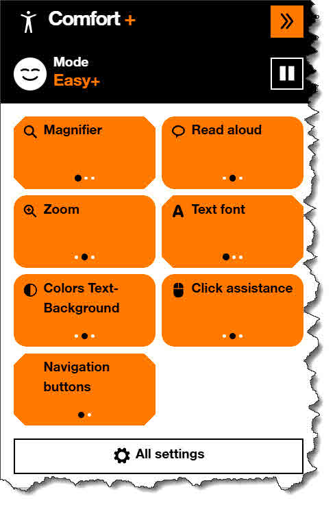 Comfort+ settings will only work correctly on websites that comply with accessibility standards. If a site is inaccessible, its functionality may be significantly compromised. A Pause button allows you to temporarily disable Comfort+.